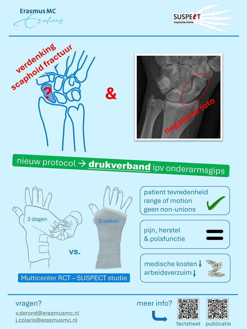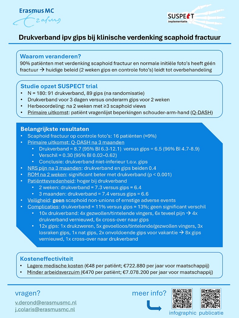 In a recent study conducted by our group (SUSPECT study / ZonMw Efficiency; 843002802), we investigated whether a pressure bandage is as effective and safe as a forearm cast in patients with a clinical suspicion of a scaphoid fracture but no abnormalities on X-rays. Of the 180 patients included across 10 participating centers, 9% (n = 18) were ultimately diagnosed with a scaphoid fracture that only became visible later. The pressure bandage showed comparable results to the forearm cast in terms of wrist function recovery. The difference in the primary outcome measure — a patient-reported outcome questionnaire — was 0.3 (95% confidence interval -0.05 to 0.62 on a 0–100 scale). Furthermore, the pressure bandage was found to be safe (no non-unions), with similar recovery in terms of pain and quality of life. Due to lower medical costs (€48 per patient) and reduced loss in productivity or work absenteeism (€470 per patient), the pressure bandage proved to be cost-effective compared to cast immobilization. Given the annual incidence in the Netherlands of 15,060 cases with only clinical suspicion of a scaphoid fracture, this translates to an annual savings of €722,880 in medical costs and €7,078,200 in societal costs.