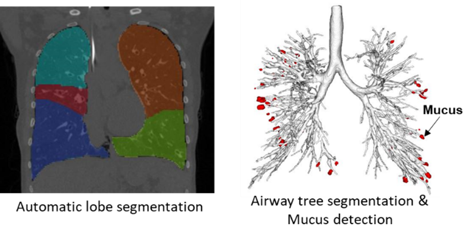 LungAnalysis has been working towards developing automated tools to quantify lung structural abnormalities. The lab has ongoing collaborations with Thirona B.V. (Nijmegen), a Dutch company specializing in cutting-edge artificial intelligence strategies for quantitative lung imaging. Together, LungAnalysis and Thirona co-developed a fully automated, sensitive system to measure bronchial widening, bronchial thickening, mucus plugging, and trapped air on chest CT. The algorithm has been integrated into Thirona’s certified software platform, LungQTM, which is installed on the virtual platform DRE at LungAnalysis, Erasmus MC. Current work on the validation of the automated tools is ongoing in a wide range of lung diseases, including CF.