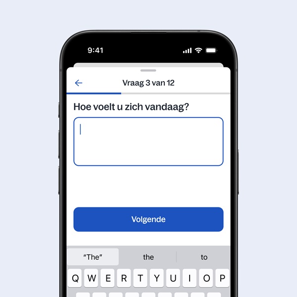 Eenvoudige vragenlijsten vult u in, in de app. Zo ziet uw zorgverlener hoe het met u gaat. Tijdens uw afspraak kan uw zorgverlener hier verder naar doorvragen.