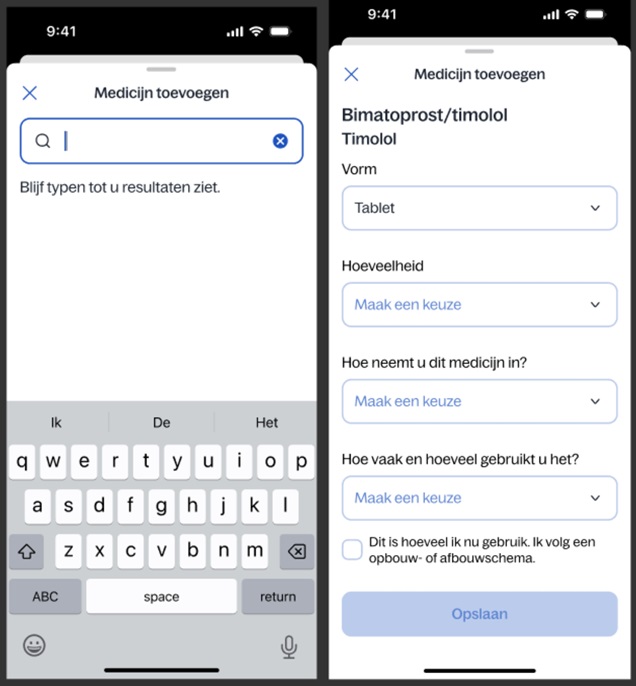 U kunt ook zelf een medicijn toevoegen. Klik op ‘Voeg een medicijn toe’, typ de naam in, kies het medicijn uit de lijst en vul de velden in.