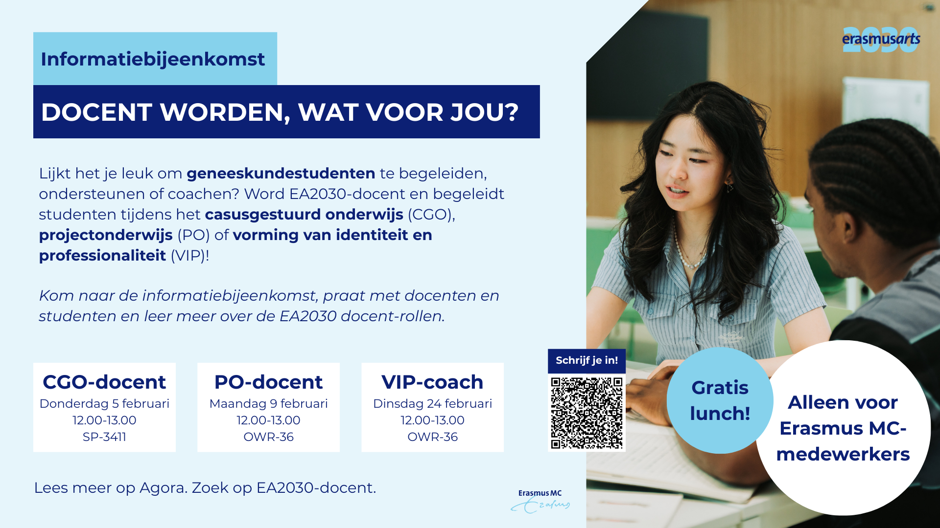 Werk jij bij Erasmus MC, EUR, of een affiliatieziekenhuis, heb jij een achtergrond in de (bio)medische wetenschappen, gezondheidswetenschappen, geneeskunde, psychologie, of andere relevante achtergrond én ben je geïnteresseerd om docent te worden? Solliciteer dan nu!