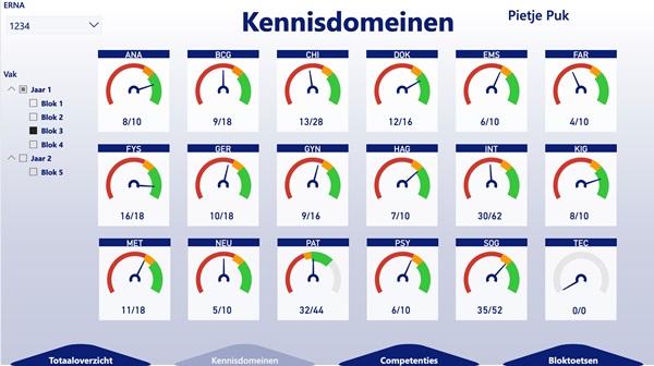 "De student heeft meer zelf de regie"De kennisdomeinen worden nog steeds schriftelijk getoetst middels bloktoetsen aan het eind van een blok. De toetsvragen gelden dan als datapunten van de kennisdomeinen voor in het dashboard. Bij de deelcompetenties komen de datapunten juist meer naar voren uit projectproducten, blokproducten, en bijvoorbeeld de evaluatie van de samenwerking na een project. De klinische vaardigheden worden getoetst met stationstoetsen waarvoor een student bijvoorbeeld een anamnesegesprek moet voeren.