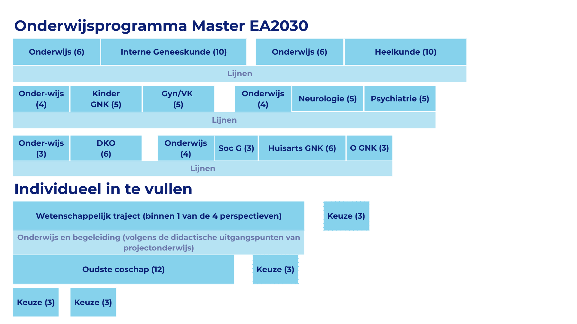 Conceptversie van het masteronderwijsprogramma (dd op 25 maart 2025). Kinder GNK: Kindergeneeskunde, Gyn/VK: Gynaecologie en Verloskunde, DKO: Dermatologie, KNO en Oogheelkunde, Soc G: Sociale Geneeskunde, GNK: Geneeskunde, O GNK: Ouderengeneeskunde