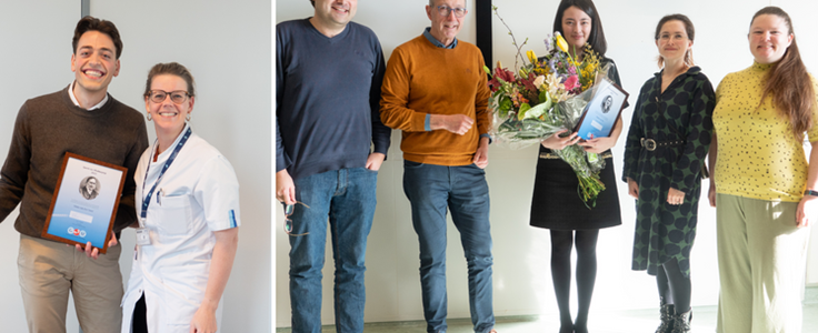 De Gerrit Jan Mulder Stichting reikt jaarlijks een prijs uit voor het beste afstudeeronderzoek van het Erasmus MC. De stichting hoopt hiermee de uitwisseling van informatie tussen onderzoekers te stimuleren. Mashiro van Dal (rechts) en Midas van den Tweel (links) wonnen dit jaar de prijs. Naast de titel krijgen de winnaars ook een geldbedrag.