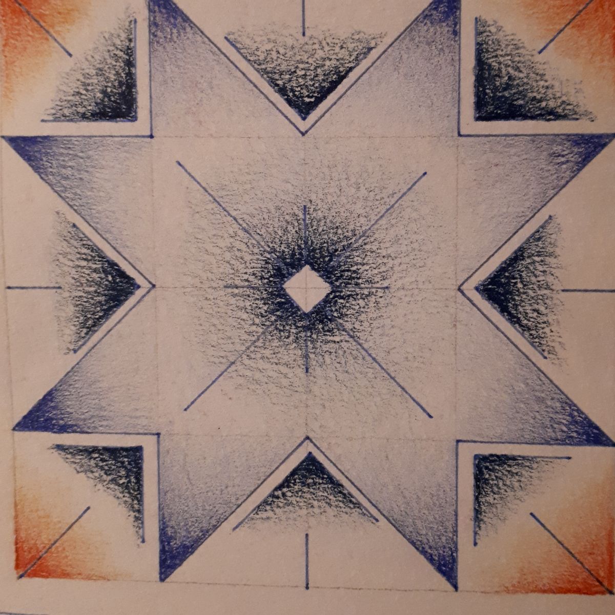 Vervolgens brengen we een eenvoudig ruitjespatroon aan in het vierkant. In dit ruitjespatroon kun je vervolgens vormen gaan tekenen; een “gevulde” vorm of een meer “spitse” vorm. Welke spreekt jou het meest aan? De gevulde vorm zou je uit kunnen werken tot een bloem-achtige vorm, de spitse vorm tot bijvoorbeeld een ijskristal.