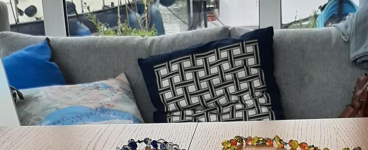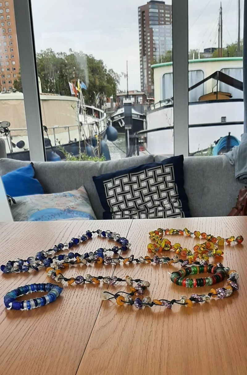 De kettingen van waxdraad gaan we knopen. De armbandjes kun je ook knopen maar rijgen op elastiek mag natuurlijk ook. Op de foto de resultaten van de vorige workshop die plaats vond in het Waterhuis van stichting Vaarkracht die vorige zomer in Rotterdam lag.