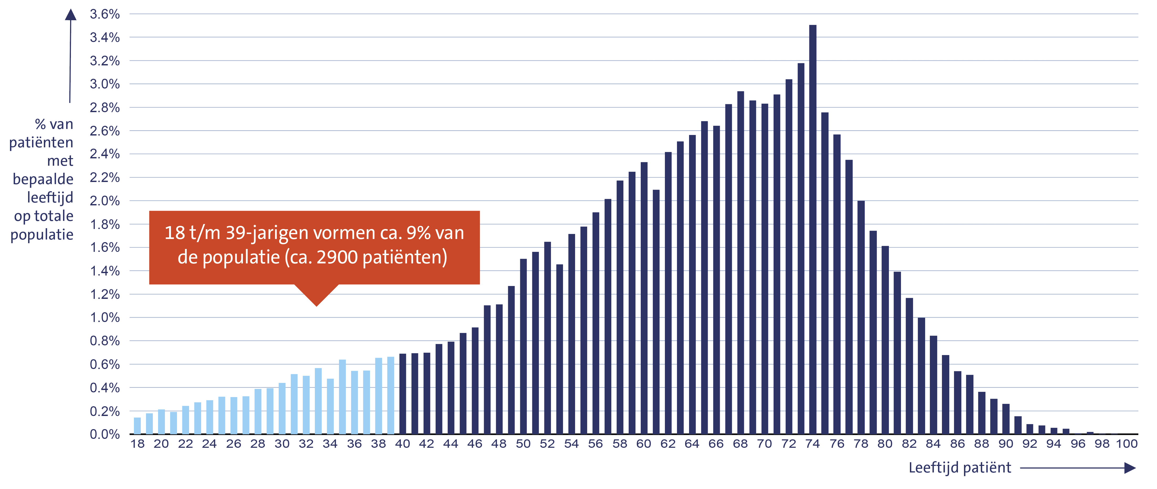 Onderstaande grafiek toont de leeftijdsopbouw van de patiënten van het Erasmus MC Kanker Instituut. 18 tot en met 39-jarigen vormen ongeveer 9% van alle patiënten van het Erasmus MC Kanker Instituut. De grootste groep patiënten is rond de 74 jaar oud.