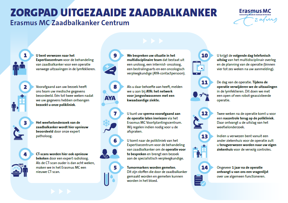 Hieronder staat het zorgpad Uitgezaaide zaadbalkanker. Hierin kunt u zien welke stappen volgen wanneer u geopereerd wordt voor uitgezaaide zaadbalkanker en een RPLND volgt.