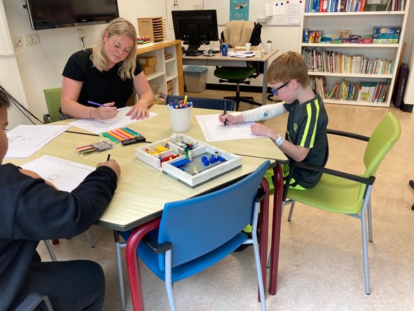 Kinderen van het Kinderhersencentrum tekenen samen onderzoeker Loes Tielen van de TU Delft hun zelfportret