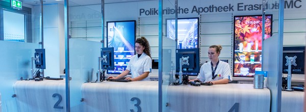 Wij hebben vier locaties in het Erasmus MC waar uw medicijnen worden klaargemaakt. Op twee van deze locaties kunt u uw medicijnen aan de balie afhalen.