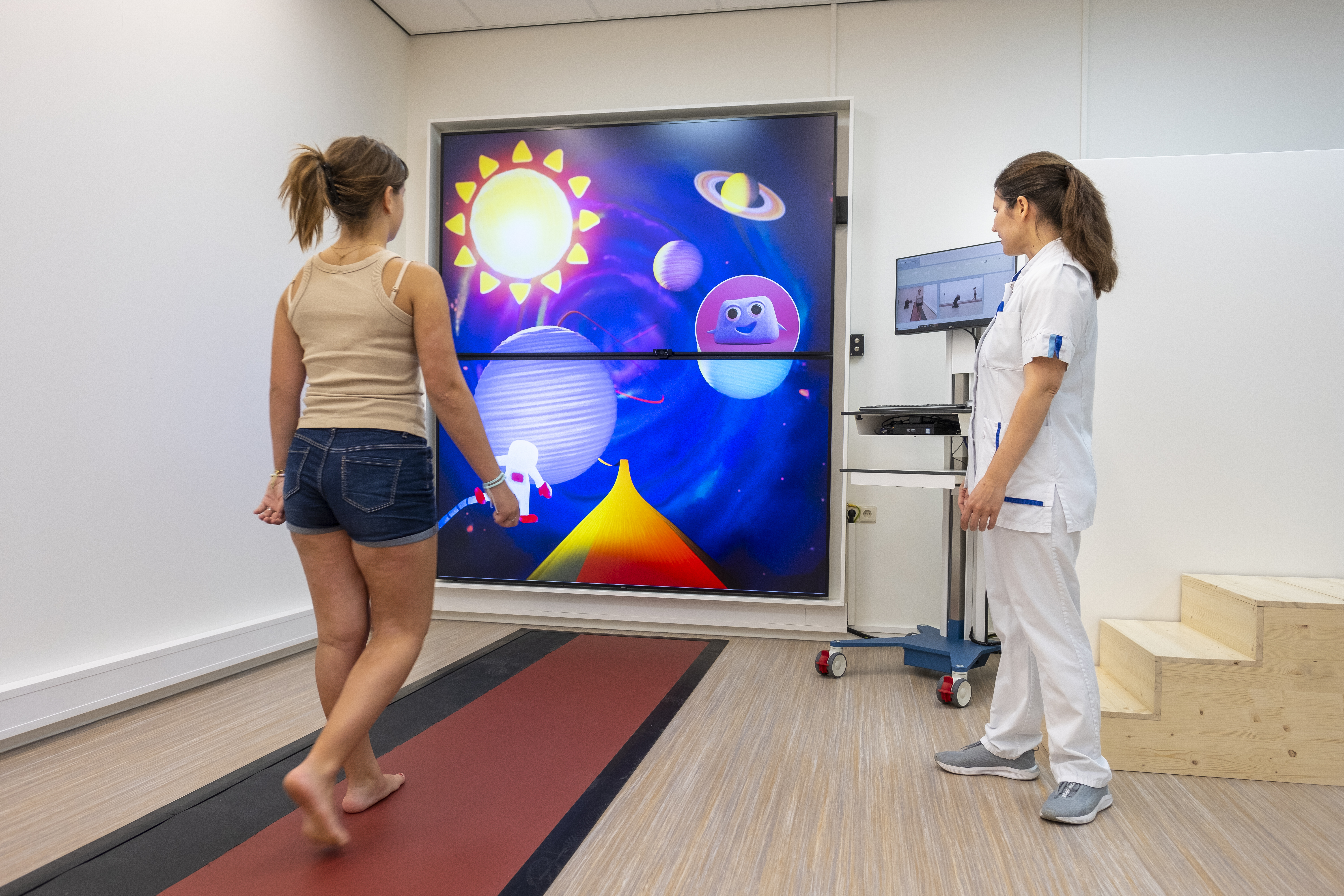 Om het looppatroon van kinderen te meten hebben we in het Kinderhersenlab een speciale loopmat. Kinderen lopen over deze loopmat in de richting van een groot scherm waarop een digitale wereld wordt getoond. Deze werelden, zoals een onderwaterwereld of de ruimte, zijn samen met de kinderen van het Erasmus MC Sophia bedacht. Zo lopen kinderen via de loopmat naar hun eigen wonderlijke wereld.
