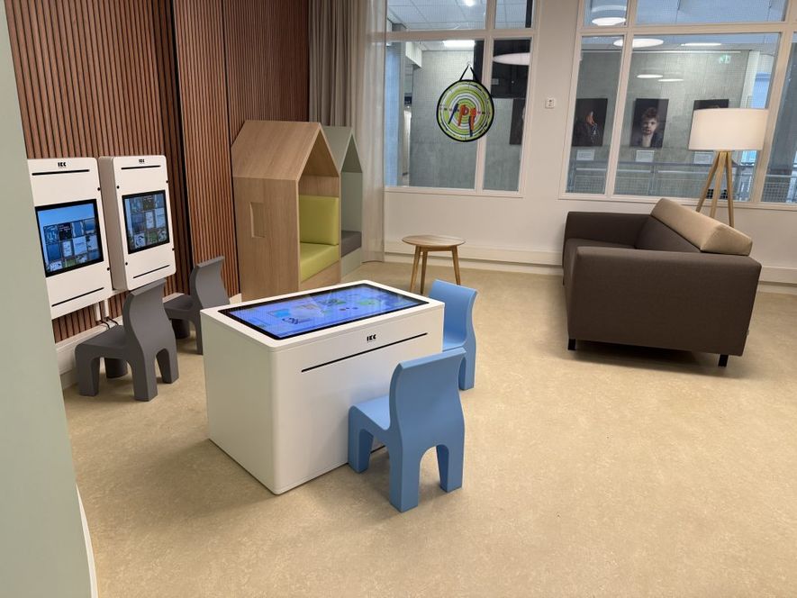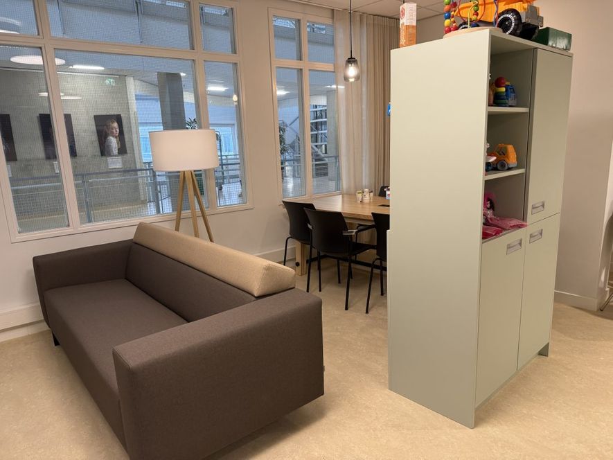 De lounge heeft verschillende zithoeken en speelmogelijkheden, voor alle leeftijden. Deze huiselijke omgeving maakt de overstap van thuis naar de operatie minder spannend en geeft kinderen én familieleden meer rust.