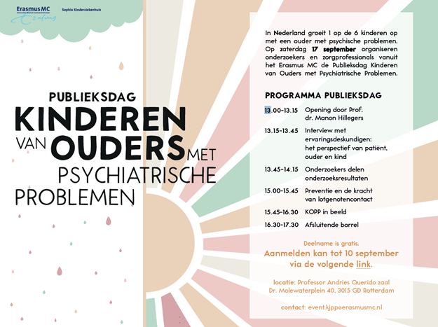 Tijdens deze publieksdag delen we onze wetenschappelijke kennis op het gebied van kinderen van ouders met psychiatrische problemen over de levensloop. Naast wetenschap, zijn er ervaringsverhalen en gaan we in gesprek met u waar toekomstig onderzoek zich op moet richten.
