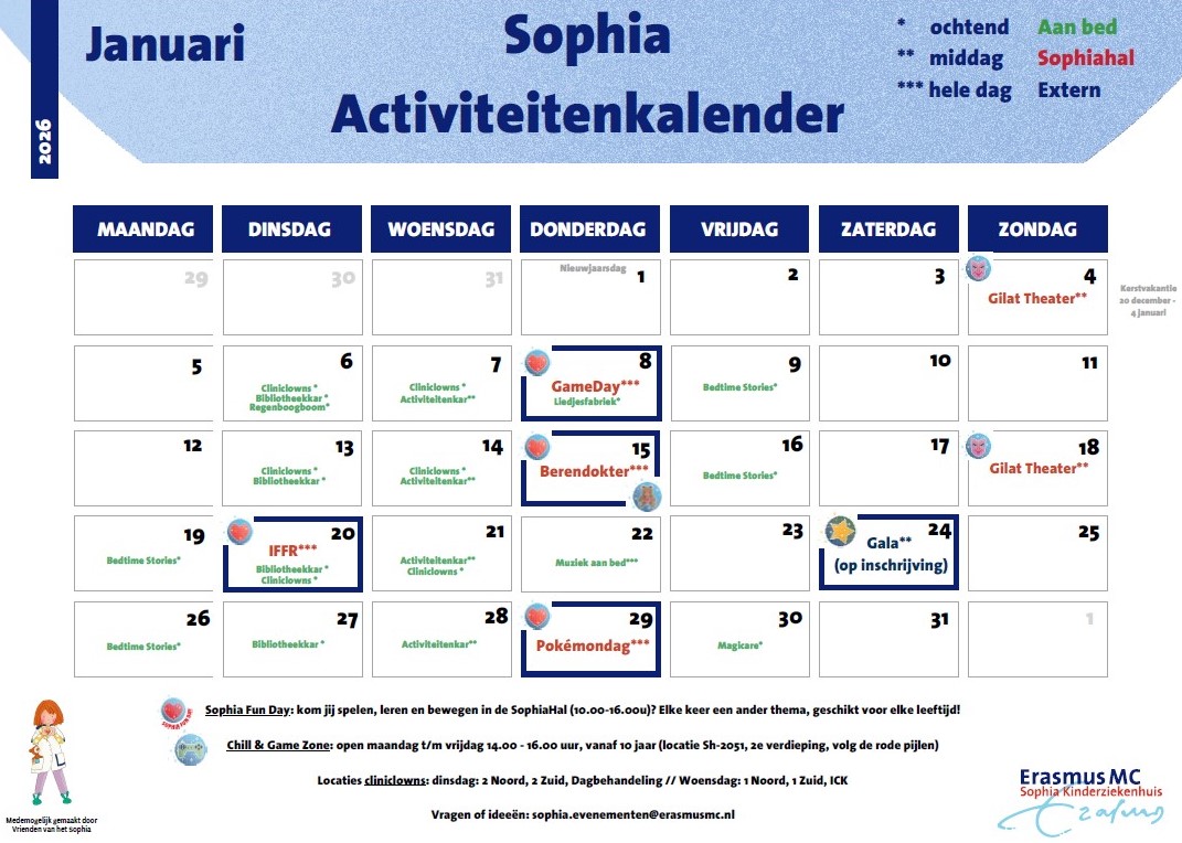 Ben jij in januari in het Sophia ziekenhuis kijk dan op deze kalender wat er allemaal te doen is!