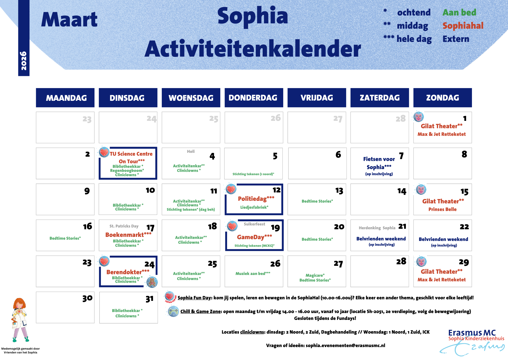Iedere week hebben wij op dinsdag of donderdag van 10.00 - 16.00 uur een Sophia Fun Day. De hal van Sophia is dan speciaal voor jullie gevuld met leuke activiteiten en is er van alles te doen, iedere keer met een ander leuk thema. Kijk in de activiteitenkalender wat wij deze dag gaan doen tijdens de Sophia Fun Day.