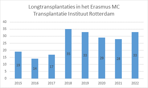 Binnen het Erasmus MC Transplantatie Instituut verrichten wij tussen de 30 en 40 longtransplantaties per jaar. We verwachten dat dit aantal de komende jaren verder zal toenemen. 80% van de patiënten op de wachtlijst ontvangt binnen 2 jaar een longtransplantatie.