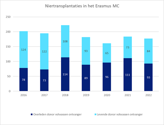 Tabel 2. Totaal aantal niertransplantaties in het Erasmus MC Transplantatie Instituut bij volwassen patiënten tot en met 2022, opgesplitst naar een nier van een levende/postmortale donor